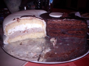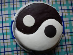 Egy másik Évi barátnőm születésnapi tortája volt. Nem tudott dönteni, hogy csokis vagy gesztenyés tortát szeretne inkább, így ezt okoskodtam ki neki. Nem volt bonyolult torta. Egyszerű kör formában sütöttm egy nagyobb adag csokis és egy kisebb adag sima piskótát, a csokisat 2 részbe vágtam. Kinyomtattam egy megfelelő méretű harmónia jelet internetről, a lapokból kivágtam a sablont, összeforgattam, így a sima piskóta 2, a csokis 4 lapból állt. A gesztenyéset a sima piskótából csináltam meg a csokisat a csokisból. A gesztenyés részben gesztenyekrém és zselatinnal megerősített tejszínhab volt, a csokisban pedig ganache (nagyon tömény volt, a szülinapos csokoládérajongása miatt). A burkolás is egyszerű megoldás volt, Chokoflex-et és fehér pillecukorból készült fondant-t használtam, a díszítésről pedig igazán nincs is mit mondani. :)